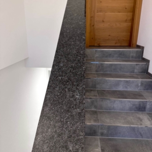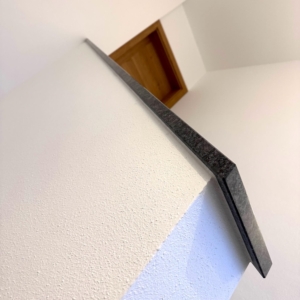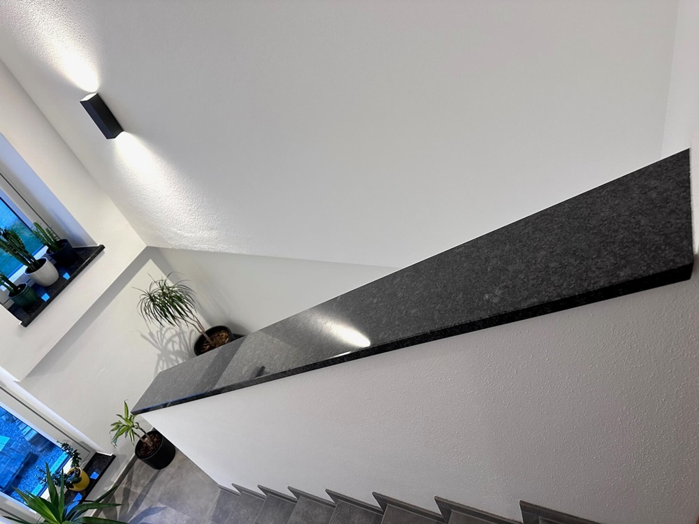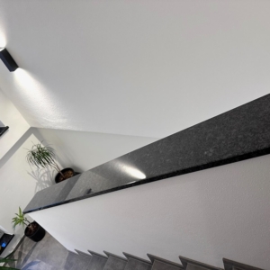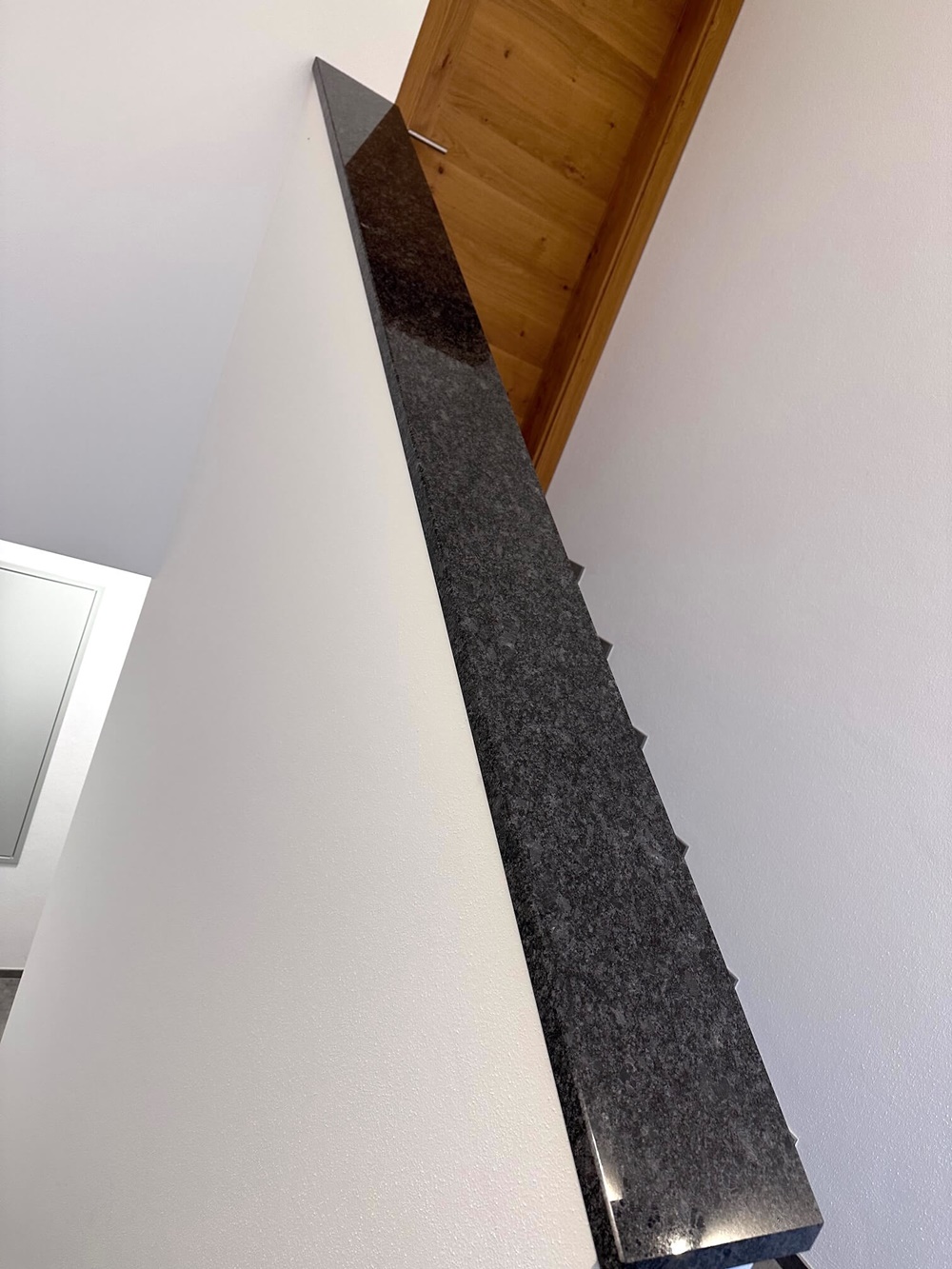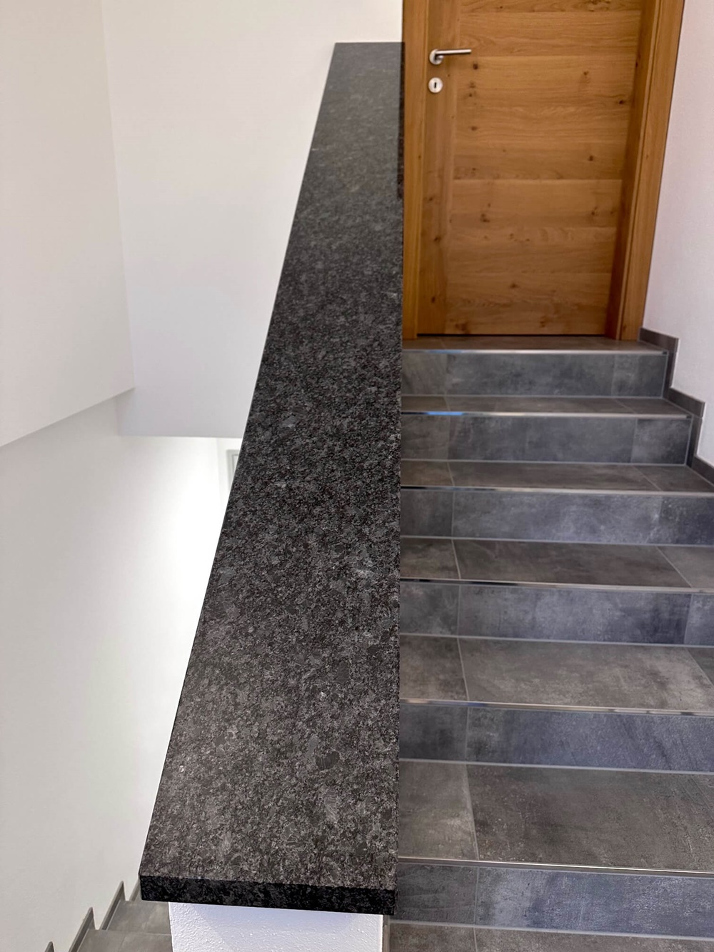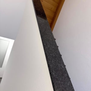 Ästhetische Stiegenbrüstung mit Abdeckung aus Granit. Dunkler Stein als Abdeckung und optischer Kontrast.