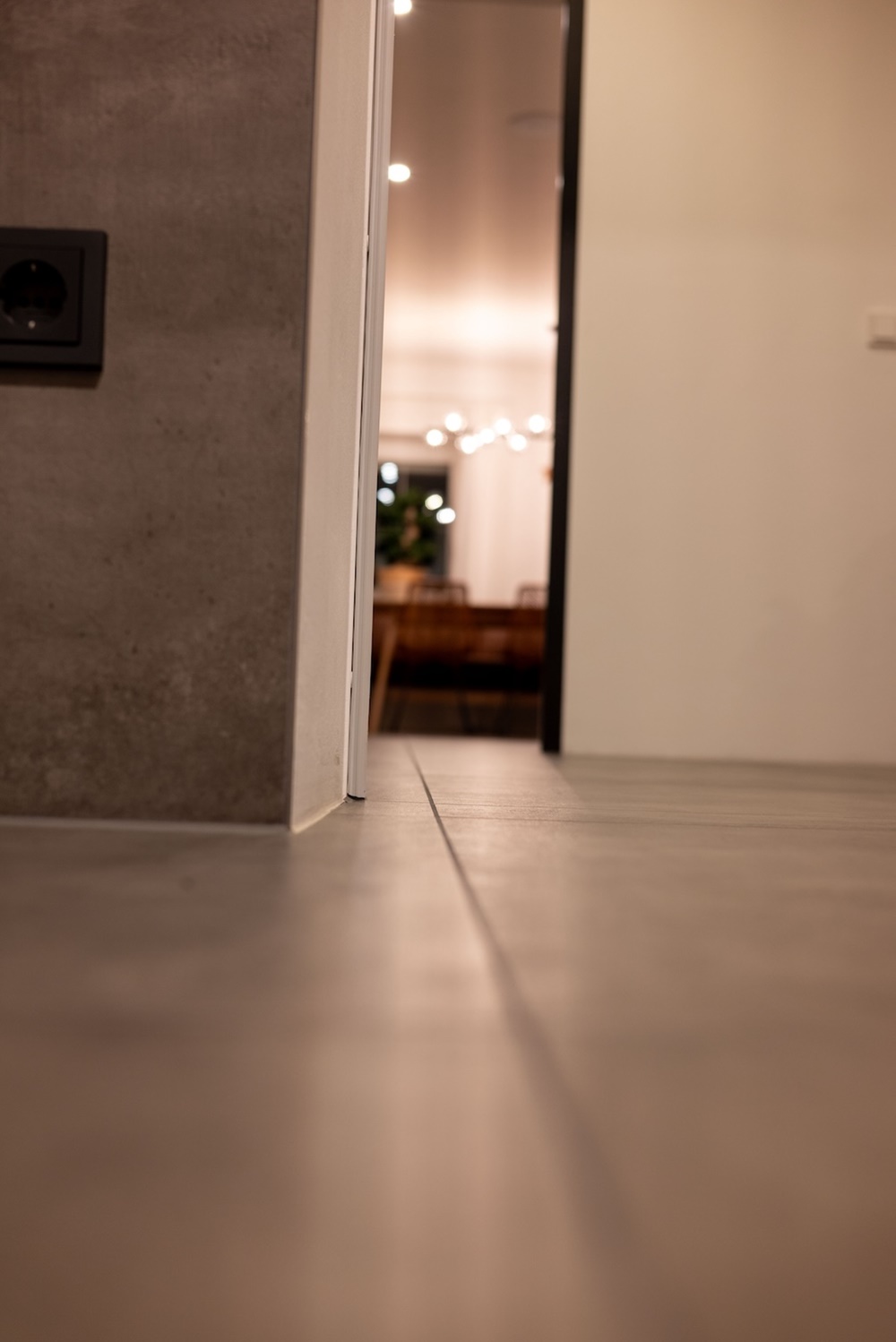Moderne Wohnküche mit fugengleichem Übergang in den Flur